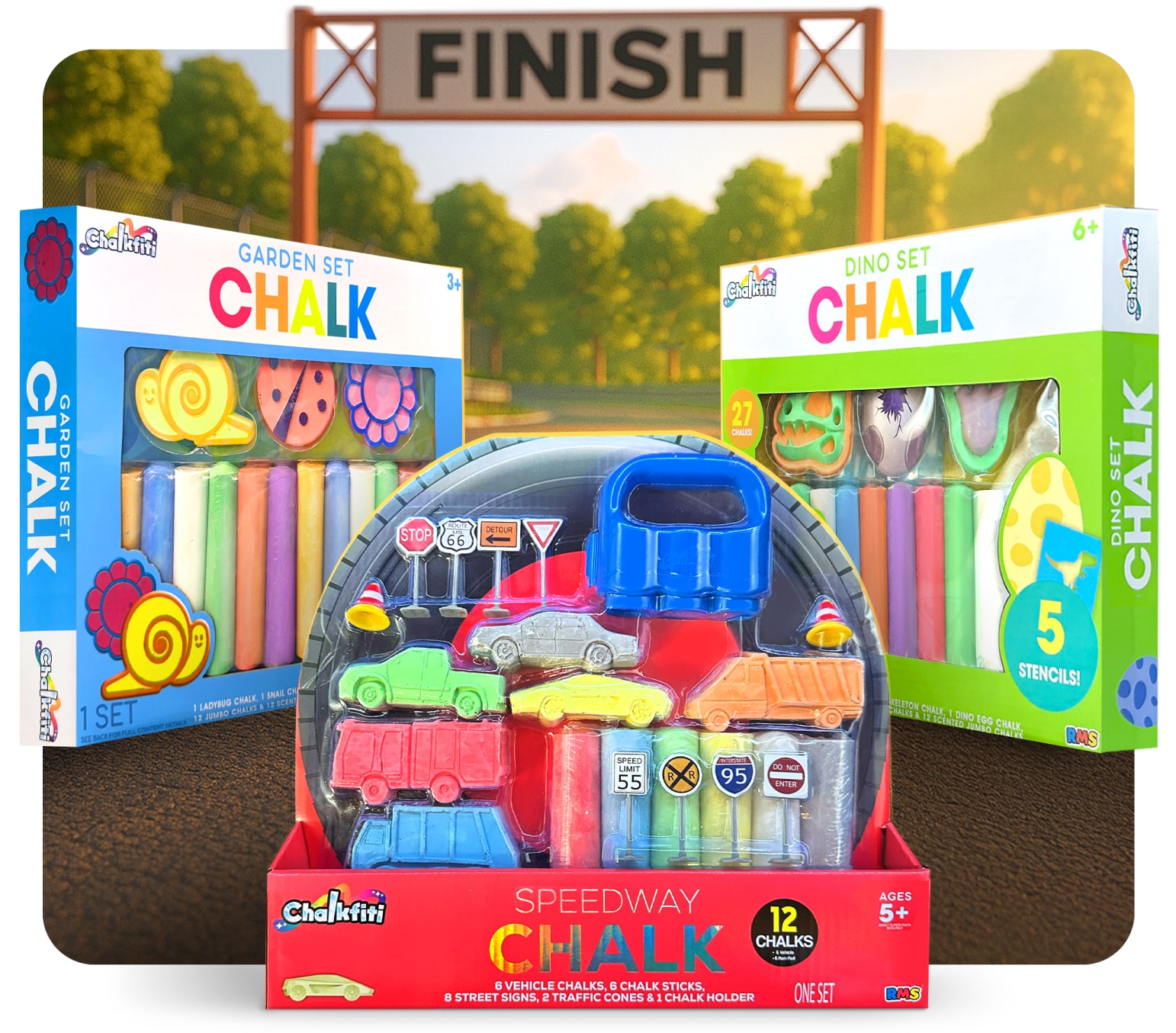 Take your art to the next level with these one-of-a-kind chalk sets! Shape your world with garden and dino stencils, then hit the speedway with car-shaped chalk, street signs, and fun accessories. Each set is packed with unique pieces that turn your sidewalk into a whole new adventure!