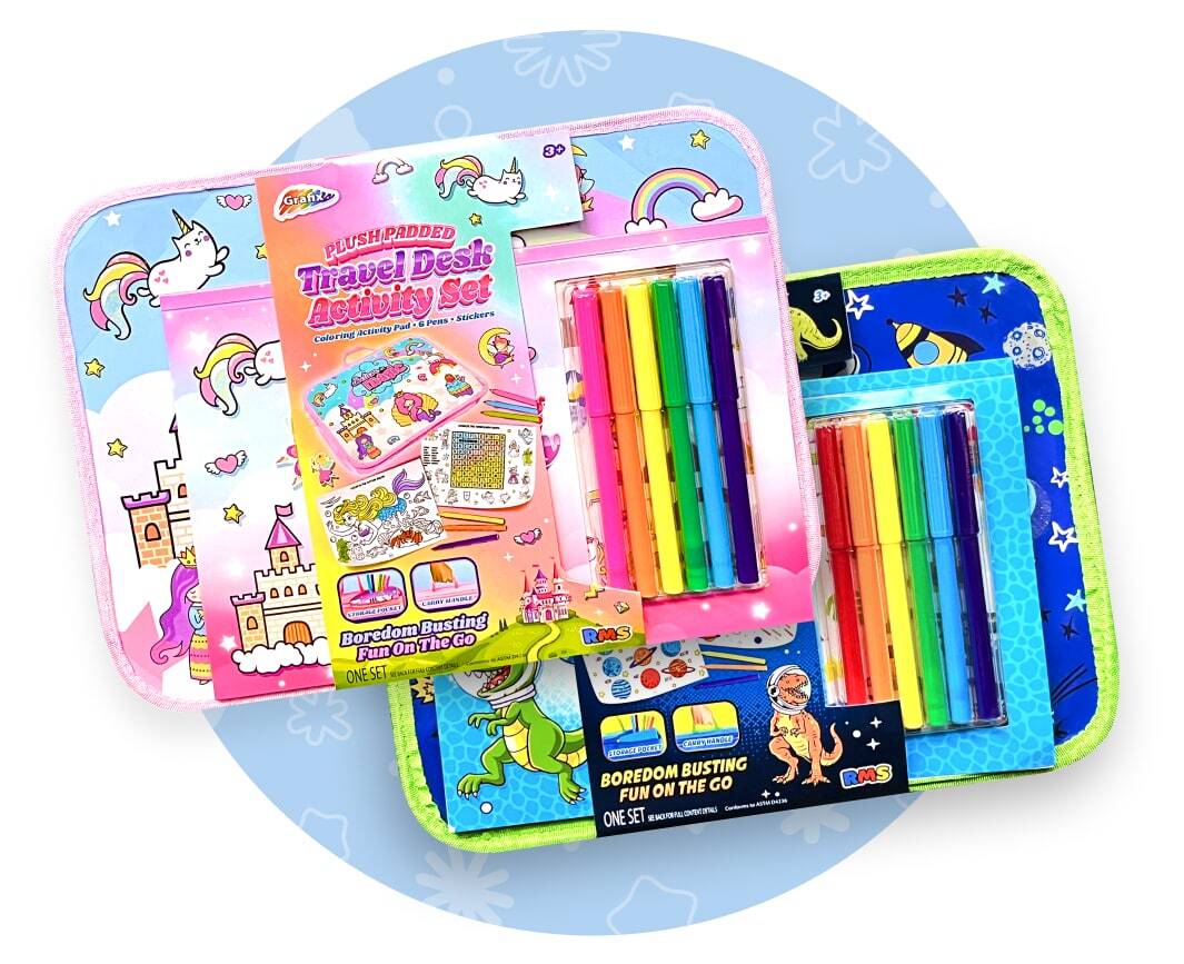 Keep the creativity flowing on the go with these Plush Padded Travel Desk Activity Sets. Each set comes packed with a travel-sized desk, coloring and activity sheets, pens, and stickers, giving kids everything they need to stay busy and inspired wherever the day takes them. Soft, portable, and perfect for holiday travel or quiet time at home, this set makes it easy for little artists to create anytime, anywhere.