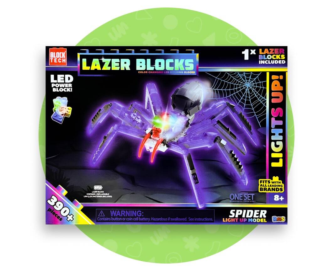 Spin a web of color with the Lazer Blocks Spider Kit. A unique addition to any collection, this kit comes with a color-changing LED block to bring your build to life. Build, display, and watch as your creation lights up the season with a touch of spooky fun.